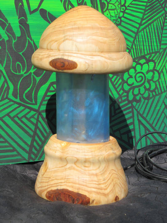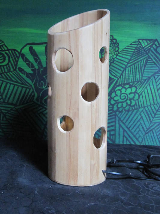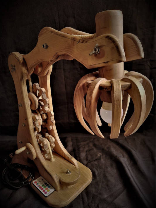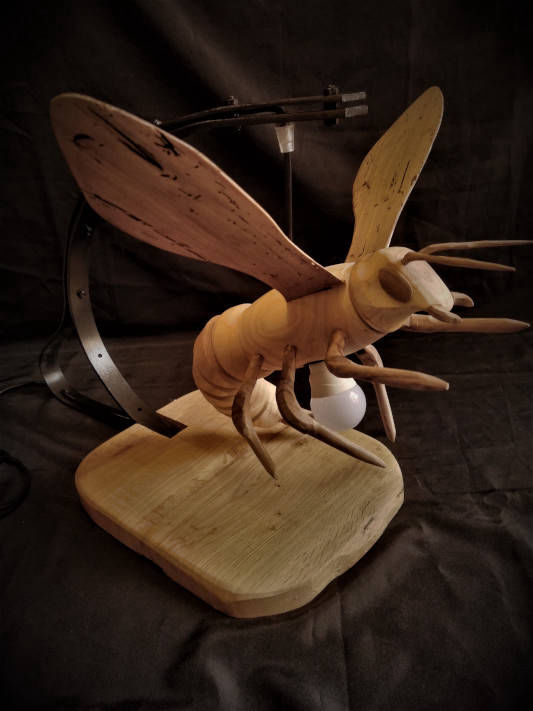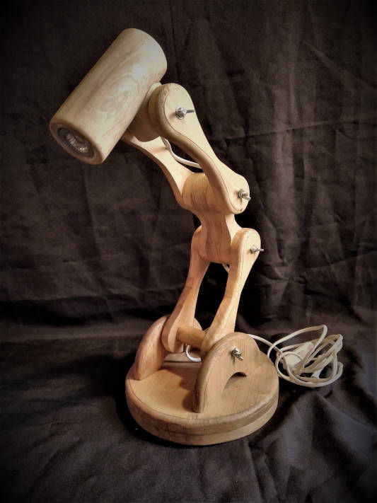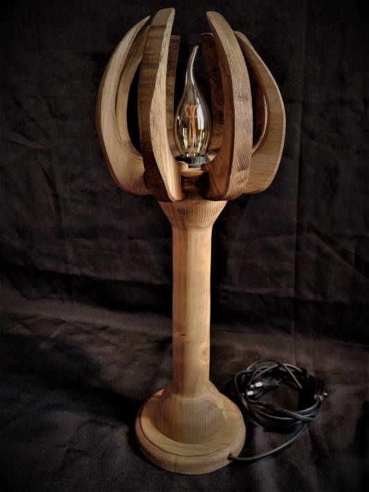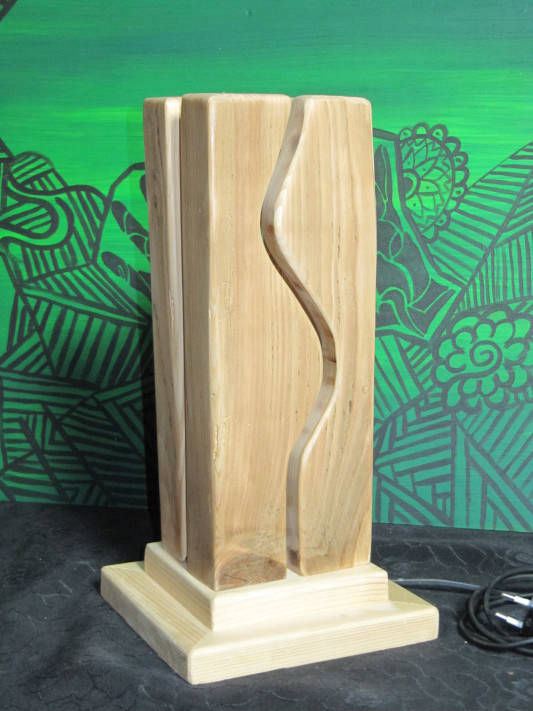 Tour à bois, chantourneuse et sculpture pour réaliser cet lampe atypique.